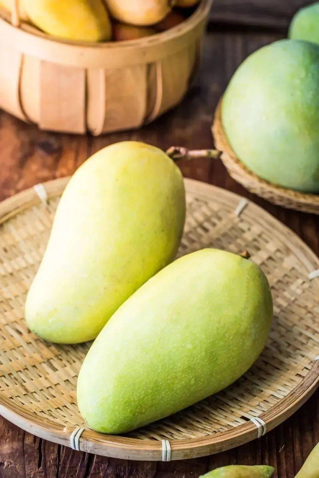 青皮芒即使它已经成熟了,表皮也还是呈现青色的,这个芒果吃起来有浓郁的浆果味道,带着股清爽的甜味,汁水丰富,粗纤维少。